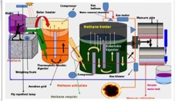 NISARGRUNA Biogas plants are designed for handling and processing the biodegradable waste resource materials generated in kitchens, vegetable markets, slaughter houses; food and fruit processing industries, agro waste and biomass in a decentralized manner. Nisargruna plant uses has aerobic and anaerobic phases for degradation of solid biodegradable waste . There are several advantages of using aerobic and anaerobic digestion serially. The solid waste is converted to simple substrates that are easily degraded by aerobic microorganisms. which are subsequently passed on to anaerobic digester for conversion into methane and slurry with microbial biomass.